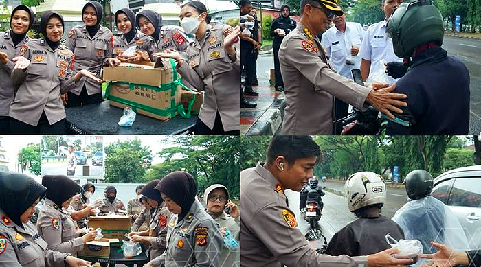 Dalam suasana Ramadan yang penuh kebersamaan, personel kepolisian tampak menyapa langsung masyarakat sambil membagikan paket takjil.